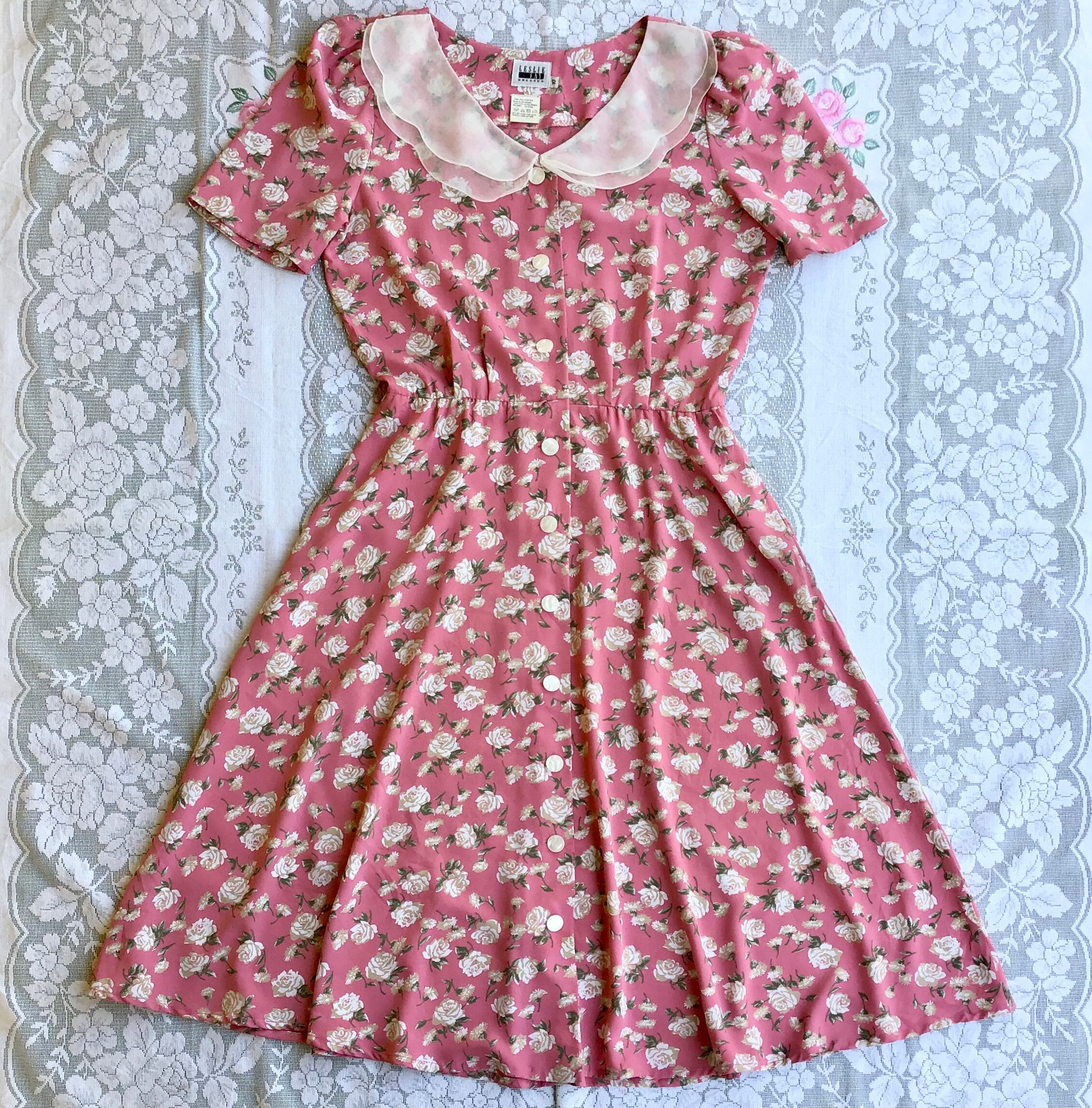 オーガンジーの大きな襟がポイントの、ガーリーな花柄のワンピースです。
