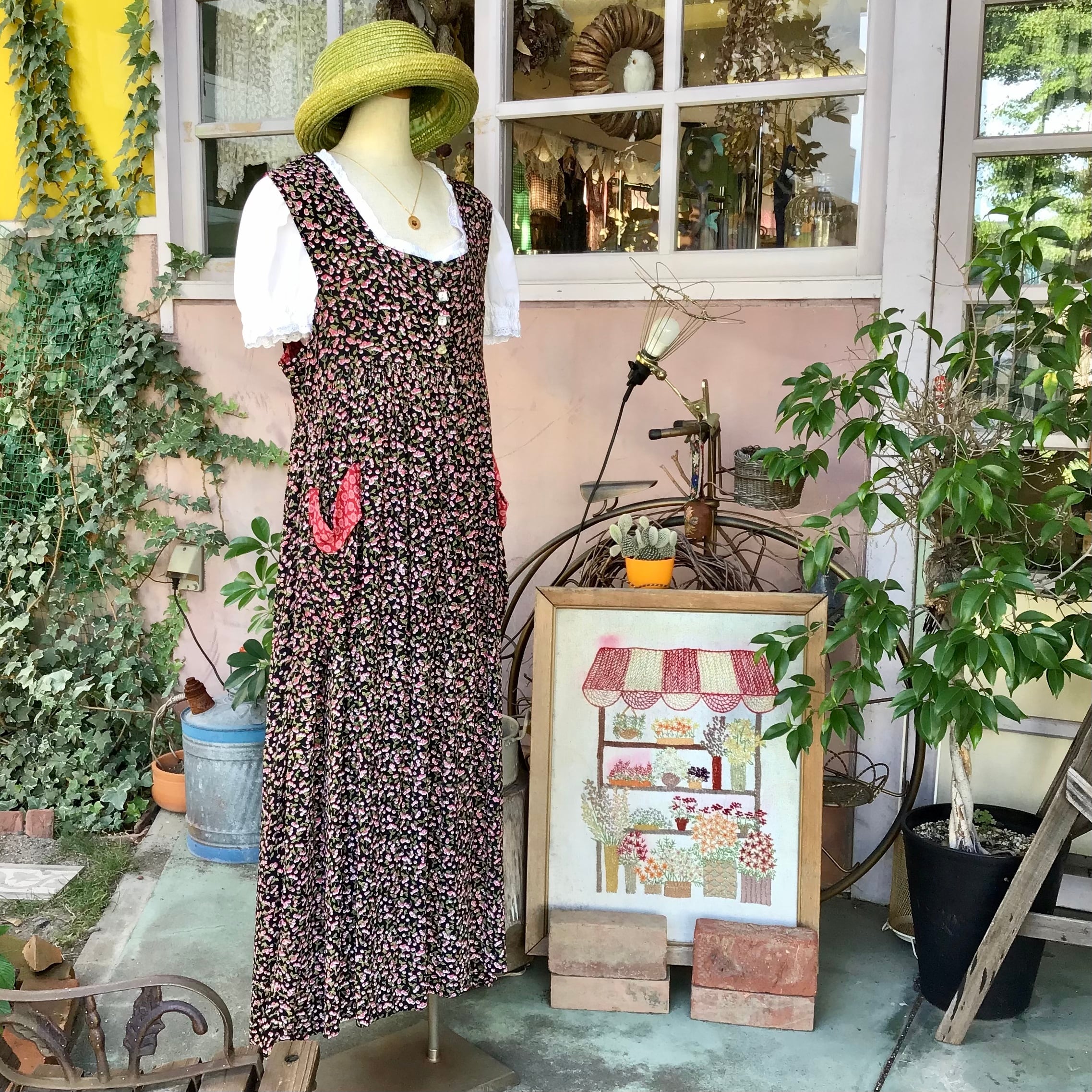 黒地に細やかなさくらんぼの模様が散らばったヴィンテージのジャンパースカートです。